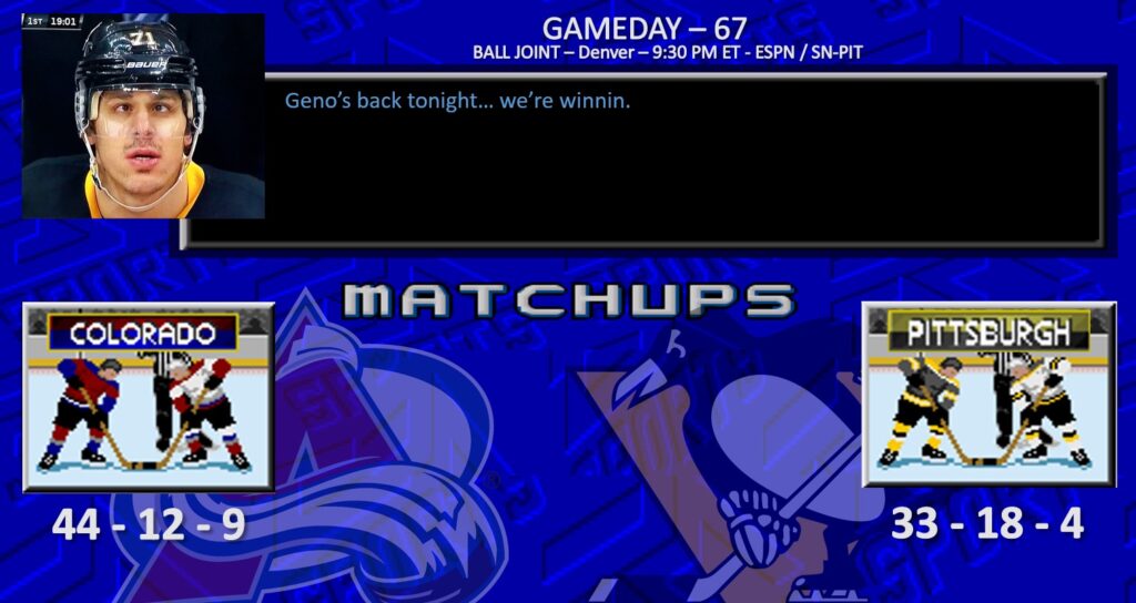 GAMEDAY 66: APPROPRIATE GAME FOR LEMIEUX TO UN-RETIRE Posted on March 14, 2026 by SouthSideGeno Continue reading →