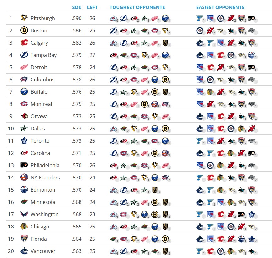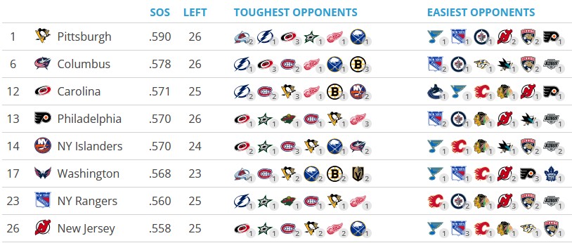 The bad news for Pittsburgh is that they have the toughest schedule in the NHL ahead of them after the break, including both contests against the League-best Colorado Avalanche and the Pacific-leading Vegas Golden Knights as well as three against the Carolina Hurricanes. If the Penguins are legit, unlike in years past they won’t simply collapse against playoff teams. So far, they’ve done fairly well against teams in playoff position, with an 8-3-2 record against playoff teams in the East and 3-2-4 against those in the West. Pittsburgh has just two breaks of two off-days in the last almost seven weeks of the season. It’s a final gauntlet that will tell the ultimate story of the Penguins’ season.