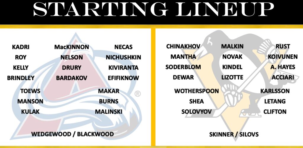 This team is stacked to the gills with skoaring talent. I didn’t even mention Makar. Lehkonen and Nichushkin are both out of the lineup so we get a teeny-tiny break there, I guess. WE’re gonna need some serious strong goaltending from either Stu or SheLoves. WE’re gonna really need MAD MAXIPAD MALKIN to kick the tires and light the fires tonight. I sure hope he’s ready to go. Go Geno, GO!